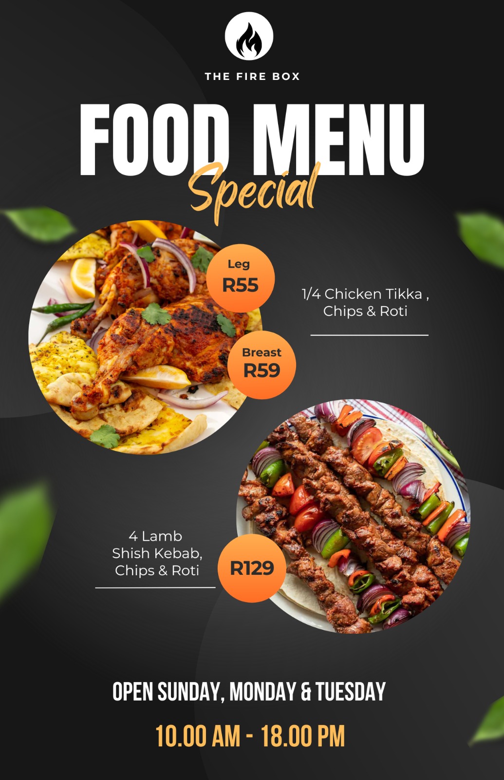 Proudly based in Durban, we also offer fast and fresh deliveries within a 3km radius, so your favourite flame-grilled goodness is always just a few minutes away. At The Firebox, every meal is grilled with care, served with heart, and packed with flavour!